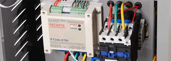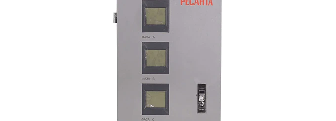 Стабилизатор работает по релейному принципу: автоматика анализирует входное напряжение и при отклонениях от нормы переключает обмотки автотрансформатора через мощные реле. Это обеспечивает ступенчатую коррекцию напряжения с сохранением стабильных выходных параметров. Стабилизация происходит мгновенно, за сотые доли секунды. Уровень КПД трехфазного стабилизатора напряжения РЕСАНТА составляет 97%.
